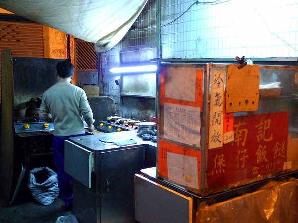 走啊走,傳來炭火香味,往右一看,「南記煲仔飯」就在燈火闌珊處,老闆的鍋爐在這兒,我們吃飯的店面要繼續彎進橫巷中,雖然有一小段距離,但是從點菜~燒炭~煲飯,全是老闆一人搞定,好犀利!