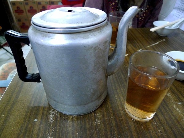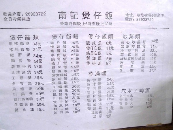 老板送上餐具和一壺熱茶,老公將熱茶倒入杯中,正準備牛飲時,被我及時制止,因為這裡的餐具看起來不是很乾淨,讓我想起以前香港僑生的同事曾教過我:熱茶要先燙洗餐具,之後才能喝!老公聽了將信將疑,看看另一桌的人已經喝掉了,不打算理我,接著聽到他們談話的口音~台灣腔,不足以參考!接著來了兩位說廣東話的中年人,老公很認真觀察他們,真的先倒一杯茶水洗餐具,然後才各倒一杯茶來喝!