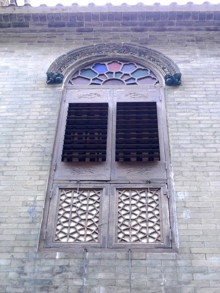 牆面上方中西合璧的窗戶,結合了蠔殼窗、西式百葉窗和彩繪玻璃的造型,最上方還有中式灰塑搭配,中西合璧,卻不會令人感到突兀。