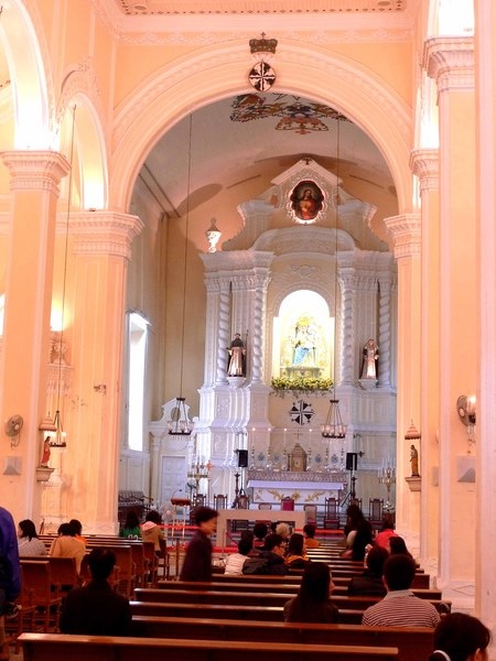 光線照射在教堂的牆壁上,呈現出粉紅色的色調,讓人感受到有一種青春少女活潑的浪漫氣息,若能在此氣氛下舉辦婚禮,應該也不錯吧!只是葡人舉辦婚禮的教堂多在又名"花王堂"的「聖安多尼教堂」,不是這裡。