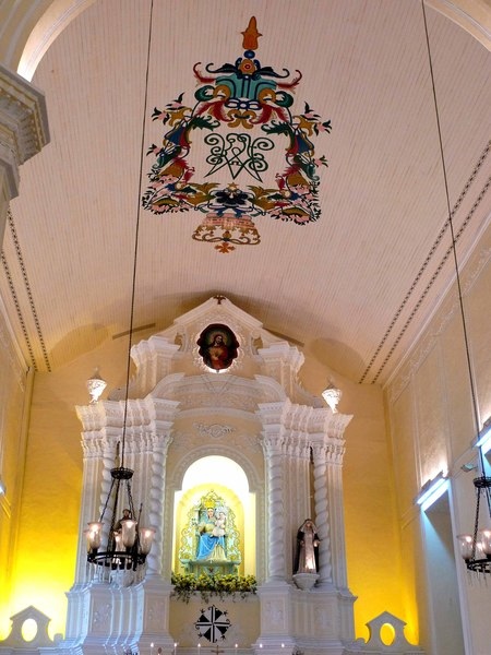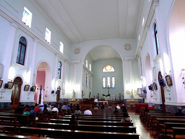 教堂內部由兩列拱門分成中堂及兩側,拱門柱頭上都有雕花圖案,天花板是奶白色的鑲板,兩邊牆上設有看台,可供人俯視。