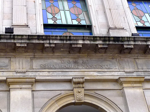 門頂上層有彩色花玻璃窗,建築帶有西班牙色彩,門楣上刻有拉丁文"SS.M.V.MARIAE NASCENTI"即[獻予童貞瑪利亞誕生]。