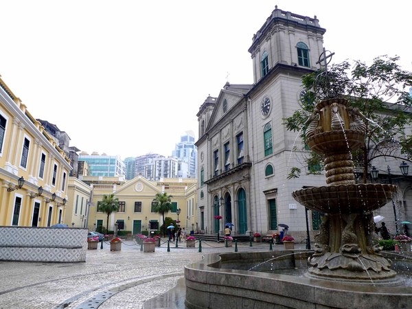 大堂前地上有一座歐式風格的噴水池,搭配著莊嚴的主教座堂及淺黃色葡式建築,真的會讓人有一種置身於南歐的感覺。