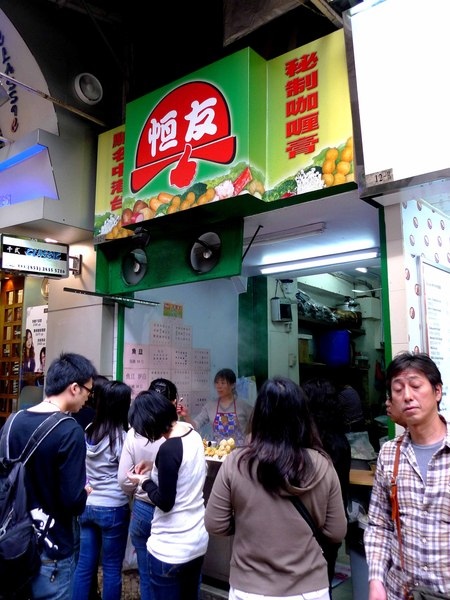 檸檬車露的對面,看到一家排隊的店家,原來是賣魚蛋的(恆有咖哩魚旦),招牌上還寫誇口地寫著對聯:"秘製咖哩膏,馳名中港台"。