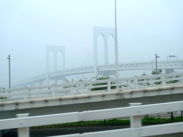 我們覺得這一座"西灣大橋"建得很漂亮,兩島之間的海面上有三座跨海大橋,就像"長虹"橫跨"鏡海",是澳門八景之ㄧ的"鏡海長虹" ,可惜今天濃霧遮蔽,我們無緣一見。