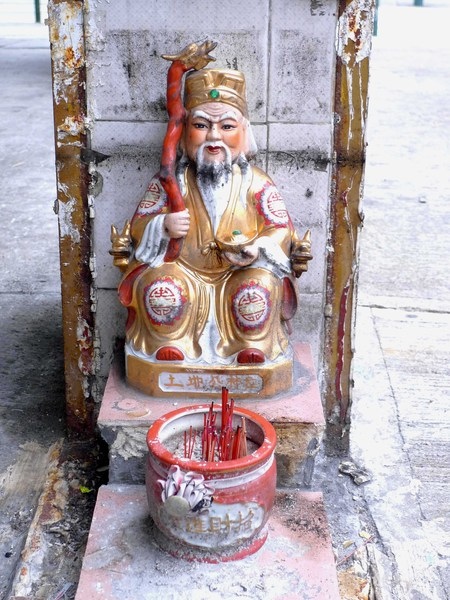 終點站"司打口"下車,繼續往前走約兩百公尺,就會到達我們住的"萬事發酒店"。途中看到路邊柱子底下擺了一尊和藹的土地公爺爺,擔心他會不會被粗心的路人踢到,不過我想我們是多慮了。