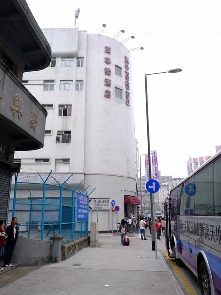 飯店門口就是很多人聚集的"粵通碼頭"公車站牌,旁邊有免費接駁車往威尼斯人對面的"新濠天地",酒店外表雖然有些老舊,猜想應該曾經是一間頗有規模的人氣酒店。