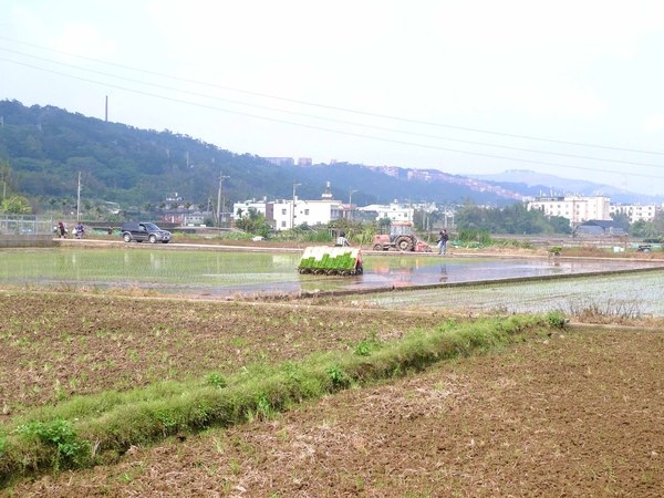 路旁的水田都已經整好地準備插秧。騎啊騎就看到一台插秧機了,旁邊很多遊客在圍觀。