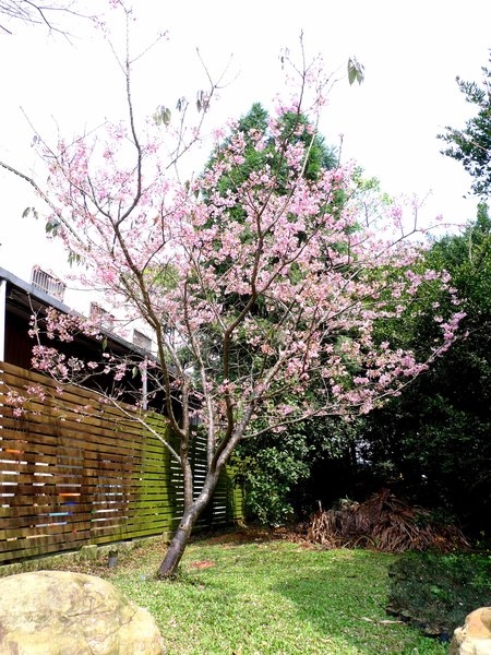 入口的茶花都已被雨水打落,山櫻花也已長出新葉,因此這一棵櫻花特別引人注目,大家都來和她合照。