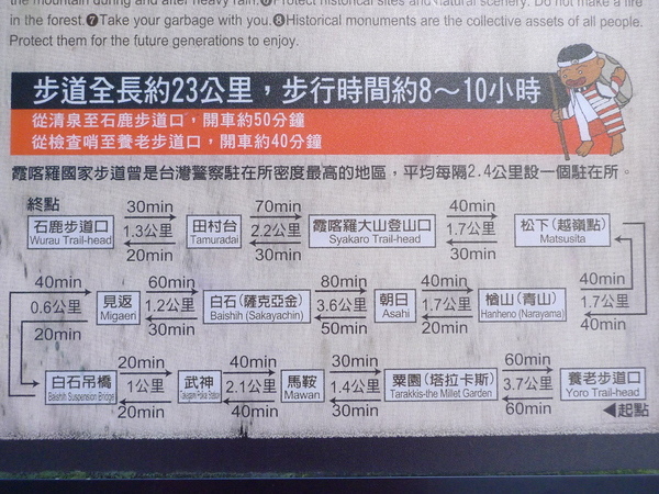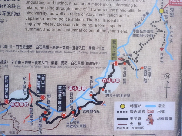 現存古道的入口,一端從清泉進石鹿,一端從秀巒進養老,全程走完要一天兩夜,但精華美景在養老這一側的「粟園竹林」和「馬鞍楓林」,所以我們今天只從養老22KM走到白石吊橋崩塌地前14KM,來回共計16KM。