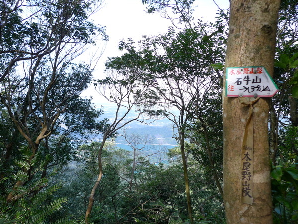 終於結束了陡上的山徑,指標指示到石牛山頂約三分鐘,山林間已可見到石門水庫的湖水。