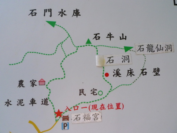 經過"石福宮烤肉區",我們的下山路是回到汽車停車場,停車場旁立著這個說明牌,才恍然大悟:網路前輩的"右去左回"是從汽車停車場往裡走,從戴宅開始走"溪床石壁"上山,然後從水泥車道下山。