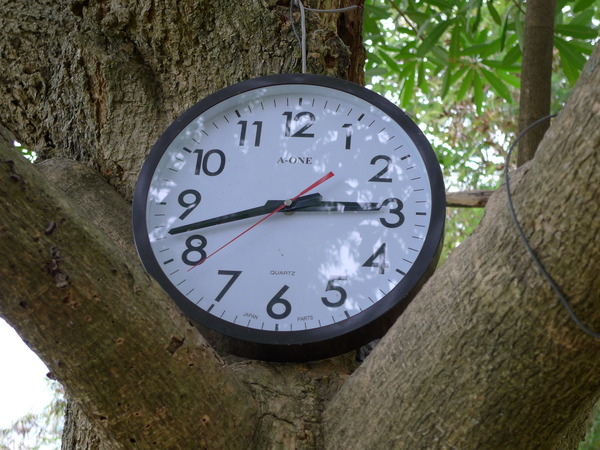路邊黑板樹上放置了一個時鐘,不知淋到雨會不會壞。