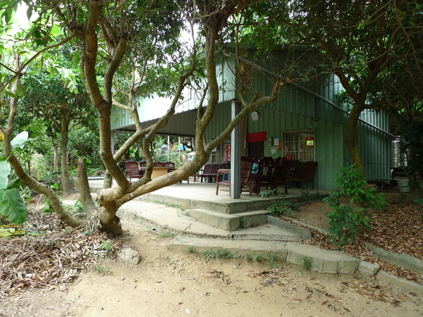 長青健康廣場,果園中鐵皮屋一座,有桌椅供人泡茶談天。
