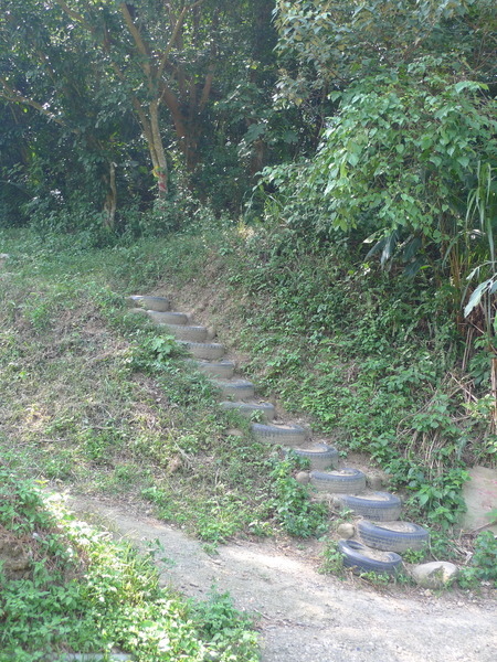 前行不久即可看到由廢輪胎鋪設的石壁潭山登山口,這讓人想起林口森林步道入口也是鋪設廢輪胎,不同的是這裡沒有指示牌與解說牌。