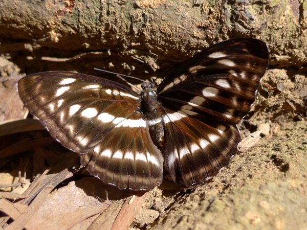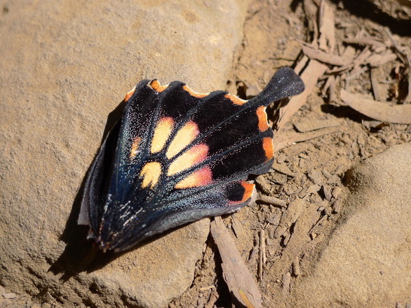 這個路段環繞著五色鳥的叫聲,抬頭找不到牠們的蹤影,正準備繼續前進時,路上赫然發現這片鳳蝶殘翼與三線蝶的屍體,不知是否為五色鳥下的毒手?