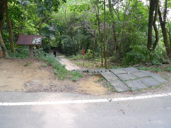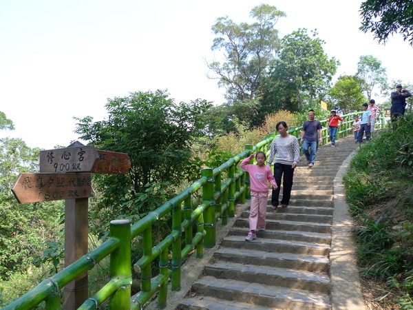 往下的階梯旁有綠色欄杆保護,沿途瀰漫著淡淡的桂花香,中途左側有往修心宮900公尺的叉路,不取,我們繼續循主道往"飛鳳夕照"方向前進。