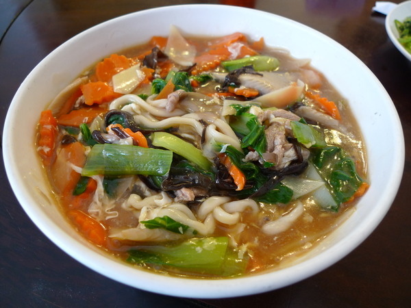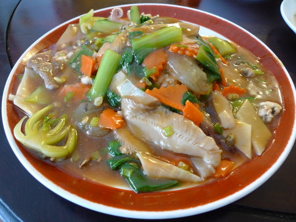 點了我的最愛"大滷麵"(65元),老婆點了排在菜單最上面的"三鮮蓋飯"(85元),外加一盤"炒空心菜"(100元),超級好吃,而且份量很夠;吃飯中,樓上走下來一脫拉庫的人,一位可能是神父的外國人還走進廚房用客家話向廚師說"好吃",我倆打算下次找多一點人來,品嚐一下它的合菜。
