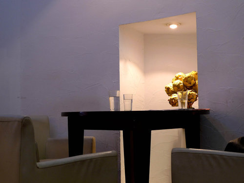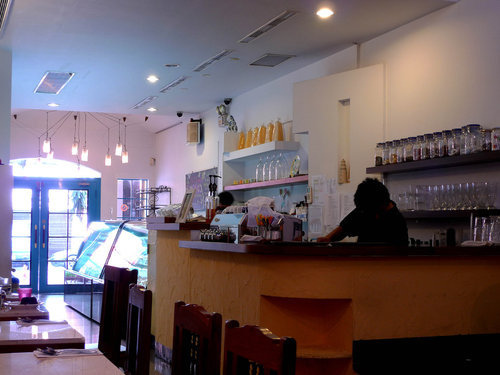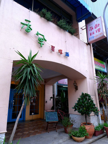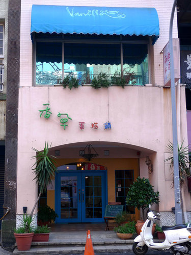 老闆是阿潘政大文藝社的學長,外交系的他畢業後到法國學做點心,回來之後在希爾頓飯店點心房工作,接著自己當起老闆,在大有路開了香草蛋糕舖,設計裝潢做點心全都一手包辦,幾年之後在桃園市民族路上開了分店,而且增加了南歐料理餐點,店面規模也大多了。