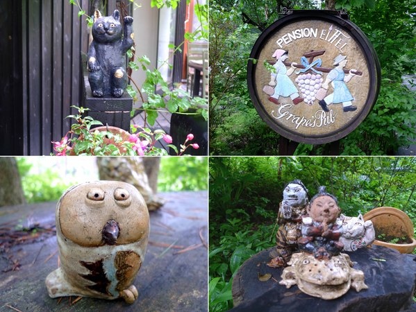 民宿隔壁是「陶人形」藝品店,還沒營業,我們好奇地在它的庭院中欣賞著栩栩如生的陶藝作品,差一點錯過約好的早餐時間。