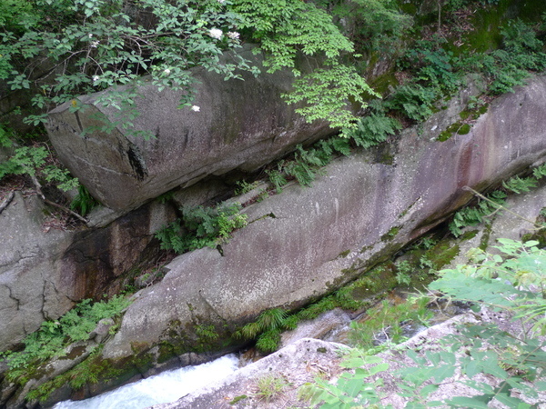 因為溪水、瀑布挾帶著小石頭急速流下,將堅硬的花崗石沖激切開而形成。