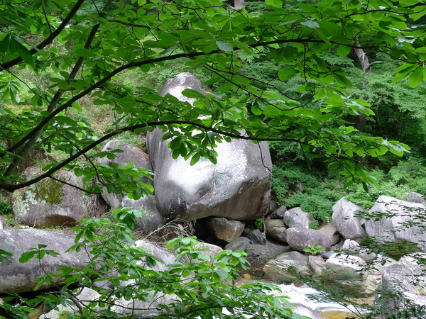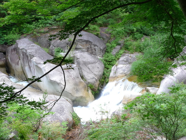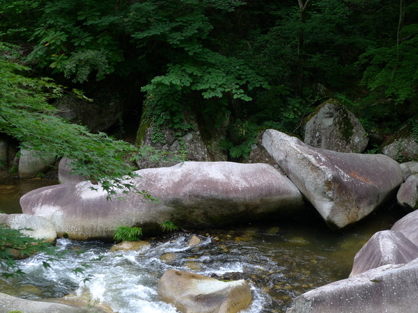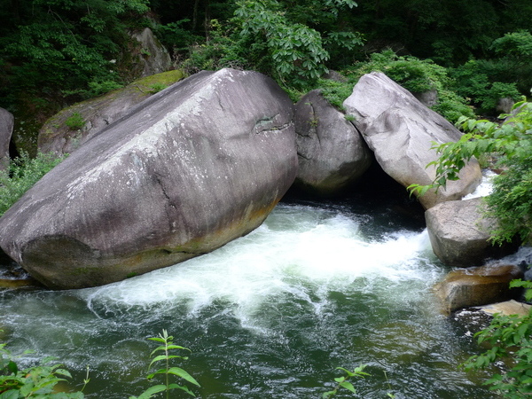 甌穴地形:照片中左邊兩塊石頭,中間有白色急流的就是。