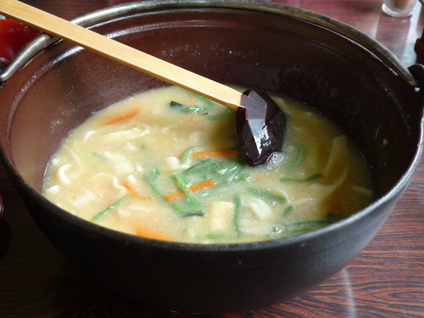 回到天神森商店街用餐,終於吃到在河口湖兩次沒吃到的甲府名物「houdou」餺飩麵(¥1100円)~~武田信玄出征時吃的戰鬥餐,很像台灣的大滷麵,寬版手擀麵條、味噌南瓜湯底,再加入各種蔬菜,好大一鍋,很好吃,兩個人點一鍋都行,我們又餓到吃了一半才想到要拍照。