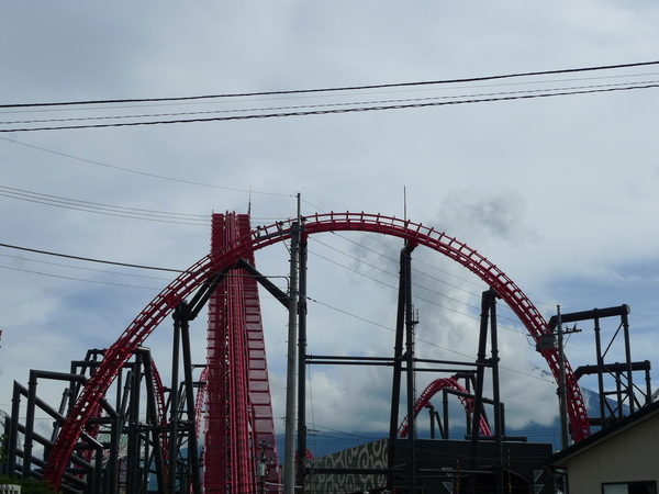 回程路上經過有名的富士急樂園,看到紅色的雲霄飛車軌道,背景富士山竟然清清楚楚地出現,非常漂亮,趕快找個地方停車,老公火速回去照相,結果才沒幾分鐘的時間,富士山又整個被雲遮住~唉,老公果然不是帥哥!
