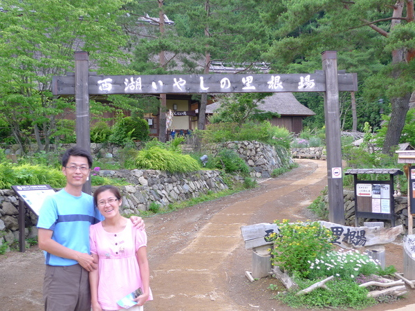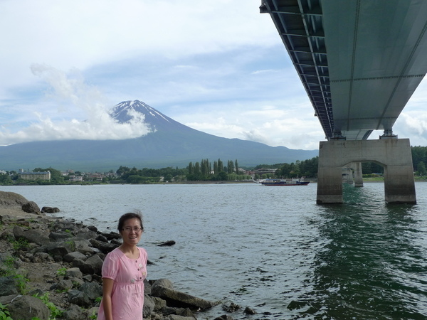走到河口湖邊,沒想到雲正慢慢散開,我們等了一會兒,終於欣賞到清楚的富士山頂,還有一些殘雪,相當美麗,超興奮的,開花公主發現我老公是帥哥,所以願意露臉了,哈哈,有志者事竟成啊!!