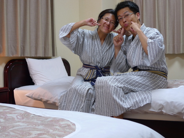 浴衣質感也不錯,中國歷史上北方的蠻族是「被髮左衽」,所以下意識就把右衽放在上面,沒想到這竟然是「壽衣」的穿法,這是最近看到伊能靜穿法和我一樣,而遭人挖苦的新聞報導才知道的。反倒是老公竟然穿對了,前輩子要不是日本人就是北方蠻族!