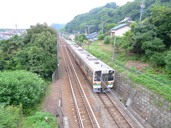 逛完了興津,就來到東海道的險處--薩埵嶺,這裡是突出於駿河灣邊的山嶺,我們跟著GPS帶路,走進了狹窄迂迴的老街中,最後一段單向車道陡上坡,前面一位單車騎士毫不猶豫地往上騎,我們卻在路口商量了好一會兒,覺得往上的道路又陡又窄,最後決定不上去了,免得發生不幸,畢竟是租來的車,小心為妙。