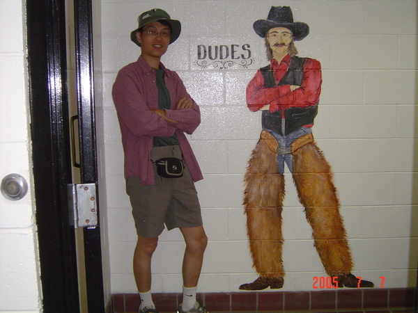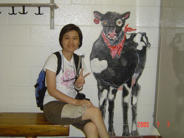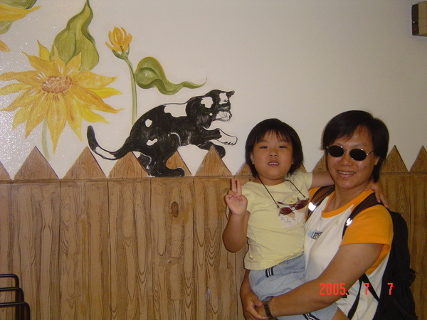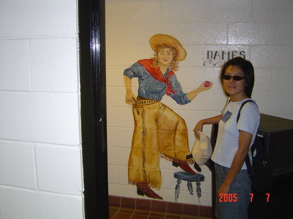 本來單純的廁所裡加上各種彩繪,感覺頓時不同,我們就分別在廁所門口照起相了!男牛仔的毛毛外褲還真炫。