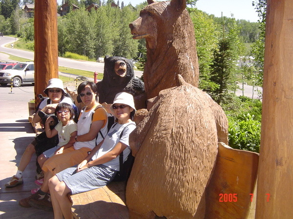 飯店門口長木椅上放置了數尊棕熊與黑熊的木雕作品,大伙休息合影,感受一下被熊族圍繞的感覺。