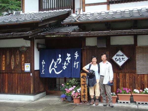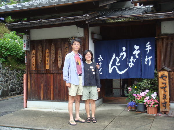 走沒幾步就遇到書中介紹「用土機蛋做的蕎麥麵店」,老闆和老闆娘看起來都很認真、很專業,不識字的我們胡亂點了幾樣,有野菜的、山藥的,我們覺得蕎麥麵要吃冷的比較吃得出口感,我們吃到後來覺得湯好鹹,偷偷加進白開水,被眼尖的老闆看見,給了我們一小壺的高湯,原來可以這樣喔!我們已經鹹了這麼久才有人告訴我們!