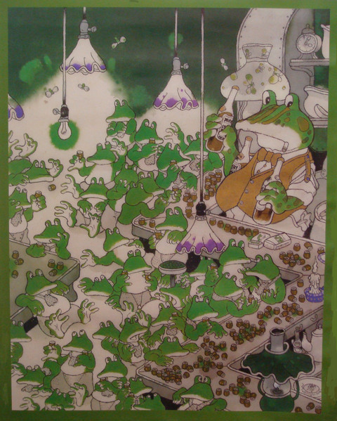 這張圖片是它廁所裡的月曆,一大群不知在做什麼的青蛙,很有趣吧!