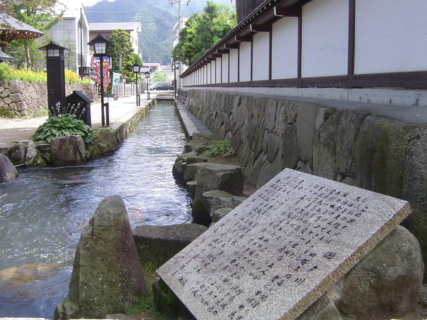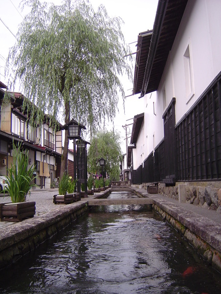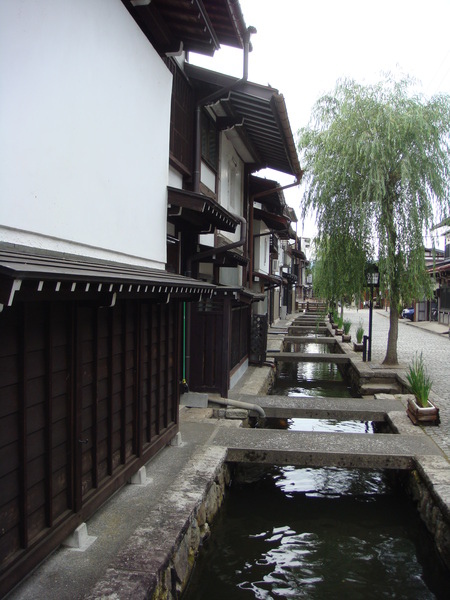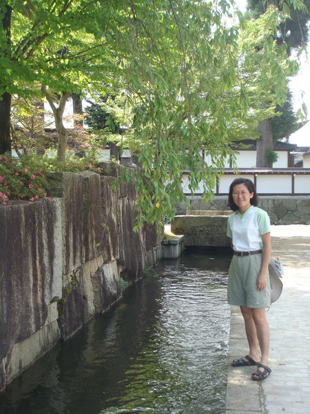 後來翻閱旅遊書,清淺小河裡,游著各色小魚,纖纖垂柳和巍峨的「白壁土藏」站立兩旁的圖片,更吸引我們。