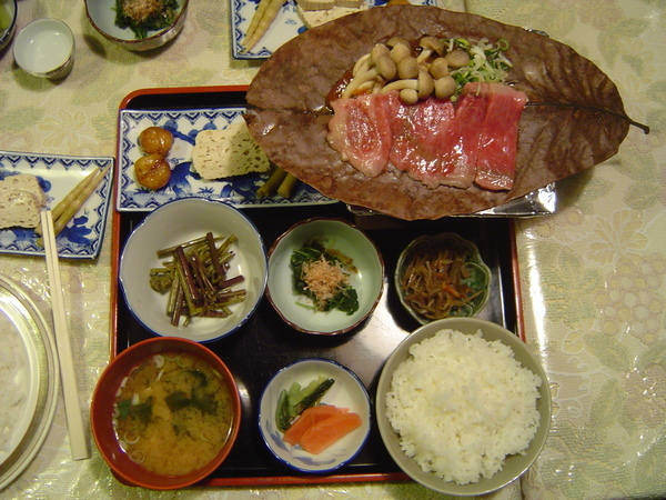 店內貼著許多泛黃的電影海報,一位年約五、六十歲的太太跑堂兼掌廚,所以等了好一會兒,但是等待是值得的,我們點的牛排餐不錯吃;在這裡一直看到的「朴葉味噌飛驒牛」當然非點不可,覺得日本的口味鹹了一點,我們總是要配上大量的開水才行。