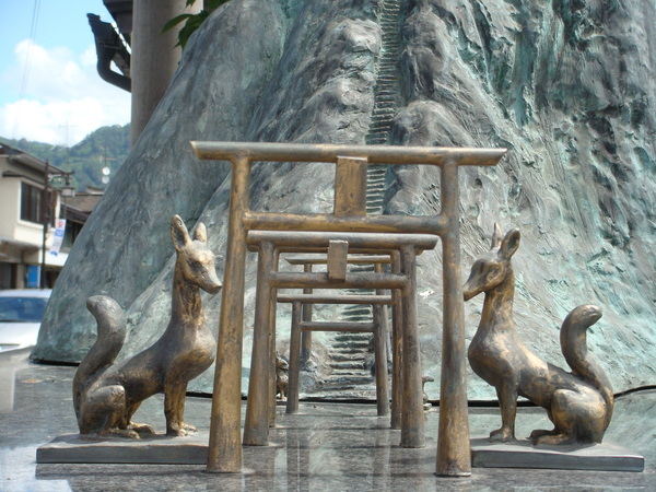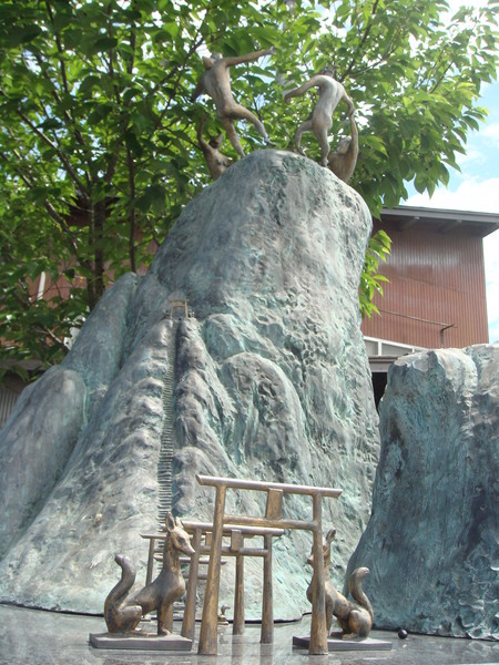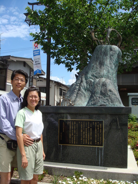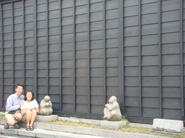 我們把車停到老街邊緣的「fule愛館」,裡面賣著當地特產,停車場旁展示中垣克久先生的「狐狸嫁女」作品。