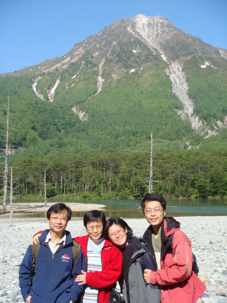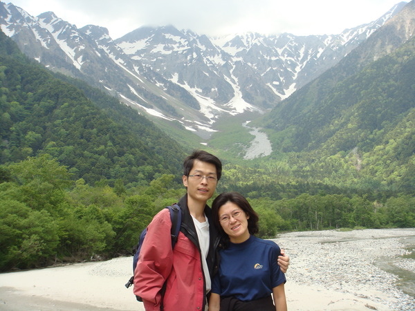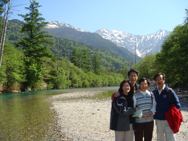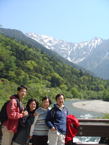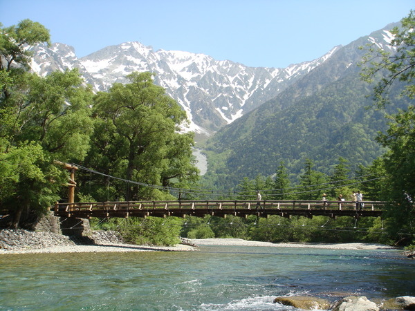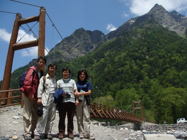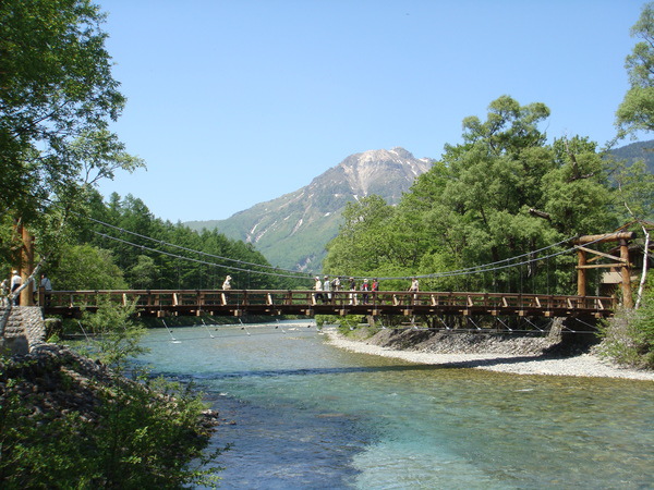 這座木造吊橋~河童橋~是上高地的地標, 從橋上往上游望去, 聳立著3000公尺以上的穗高連峰。