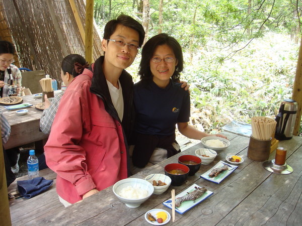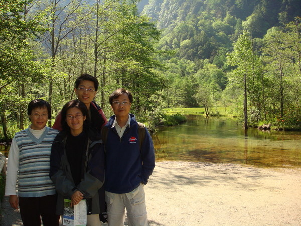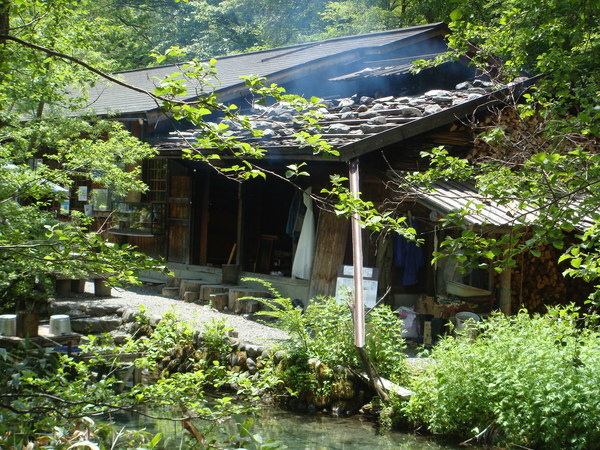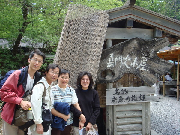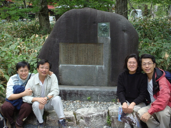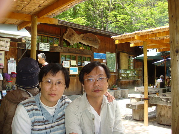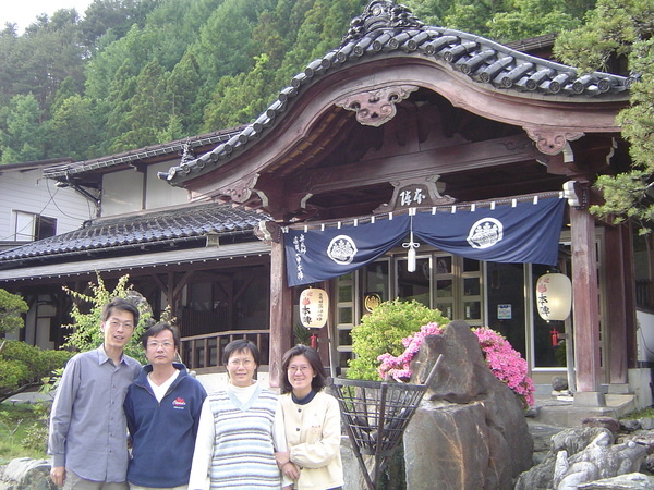 下山之後天色仍早,到新平湯溫泉區打點食物,可是晃了好幾圈,連個7-11之類的都沒有,想吃零嘴也只有這裡的特產和漬物可選,只好去泡溫泉,旅遊書中介紹在471公路旁的"梔尾溫泉"群山環抱,有自然野趣,很吸引人,我們一去,沒人,而且很乾淨,心想:太好了!細心的姊夫前後左右逛了一圈,發現男女相通,而且從外面的公園就可以走進女湯裡,這可不太好,幸好姐夫發現了,不然可虧大了!