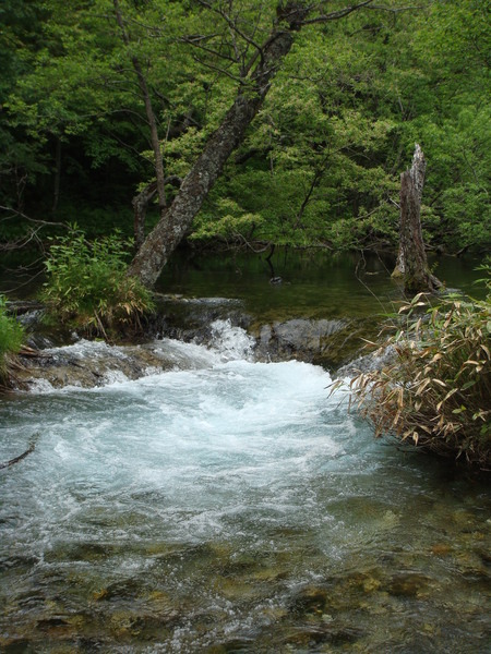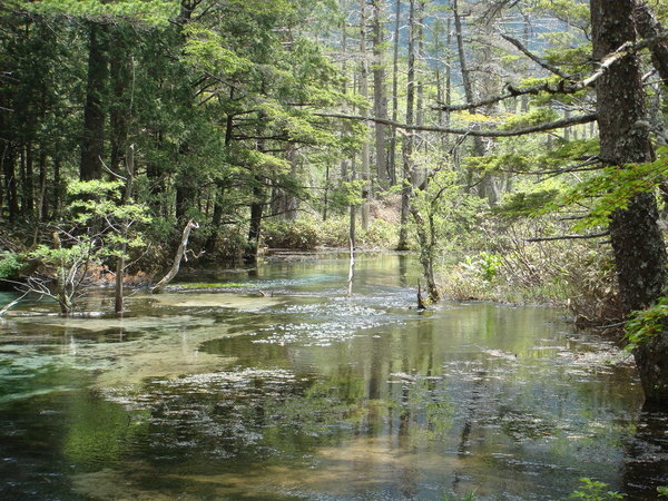 由於有地下湧泉,這裡的水質非常清澈。但是池子正前方的霞澤岳不斷注入泥砂,而且池底的枯葉不斷堆積,使得池子逐年縮小,有些地方已經變成濕地,水流非常清淺。