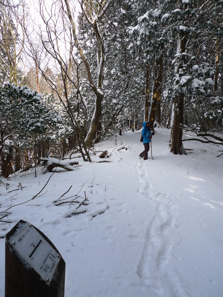 一進樹林就陡下190公尺,積雪覆蓋,完全見不到步道,不知該走哪邊才好,還好下山,居高臨下,可以看得比較清楚,我們沿著山稜線前進。