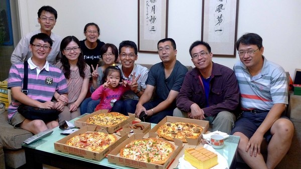晚上六點大家都準時地出現,但是我們兩個笨手笨腳的主人卻尚未就緒,玉米濃湯還在煮,披薩還沒訂,丟著大夥兒幫我們看家,趕緊把晚餐買回來,正好熊班長也下班,先來個大合照,愉快開動了!