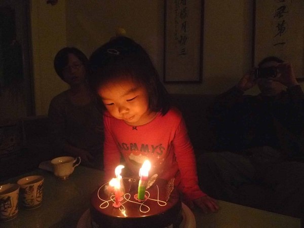 大壽星帶著小壽星切開蛋糕,小壽星好奇的一直低著頭看著正在切的蛋糕,可愛的小臉蛋都被遮住了。